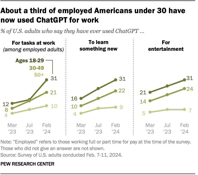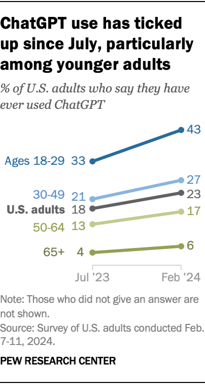 - あるタスクに特化した生産性向上は現実のものとなっている(※訳注8)。ほとんどの知的労働者はChatGPTを使わなくなったかもしれないが、全体的には1年前と比べてより多くの人がChatGPTを試しており(※訳注9)、生産性を向上させる方法を見つけた人たち(主にプログラマー)は大きな報酬を得ている。
