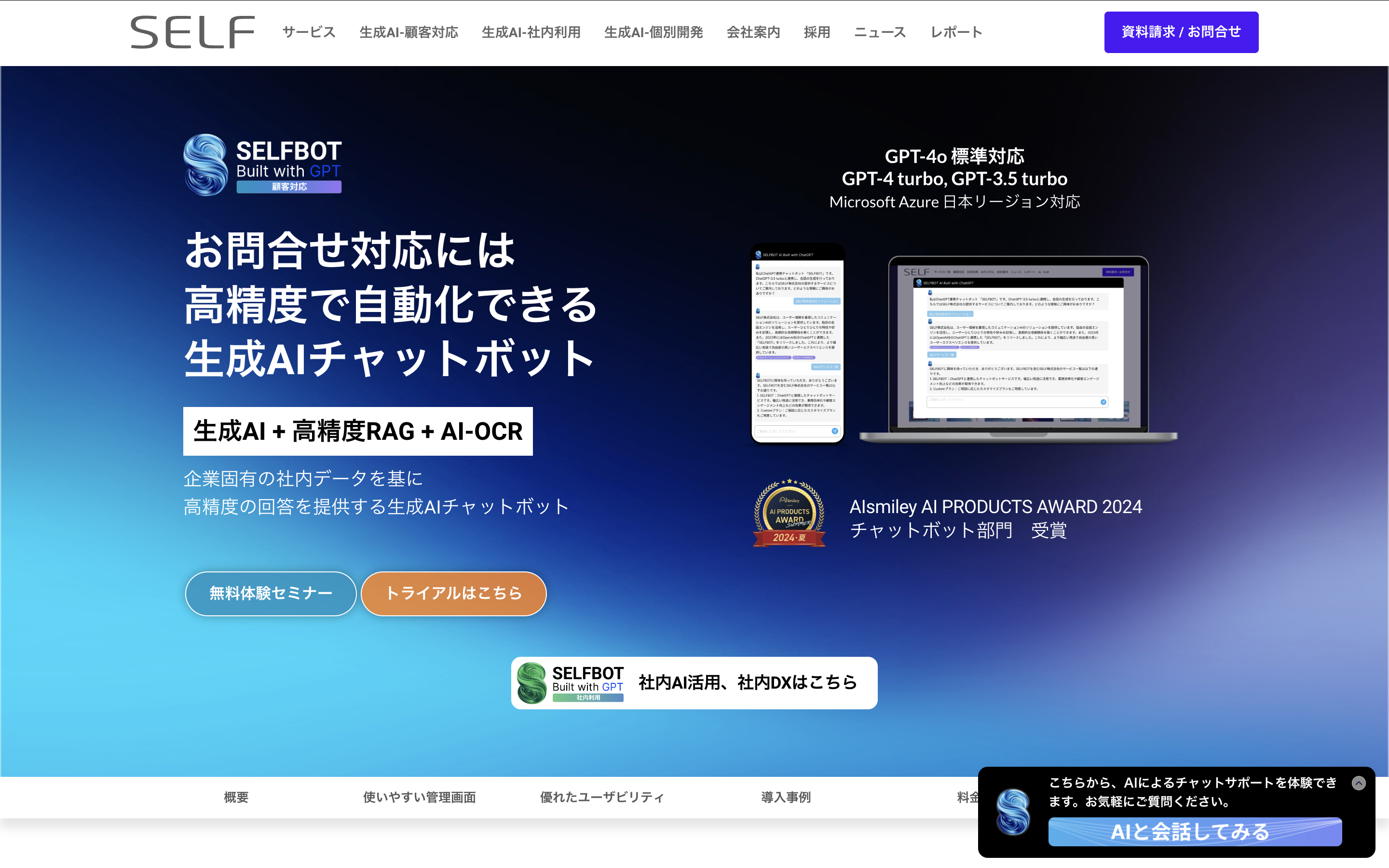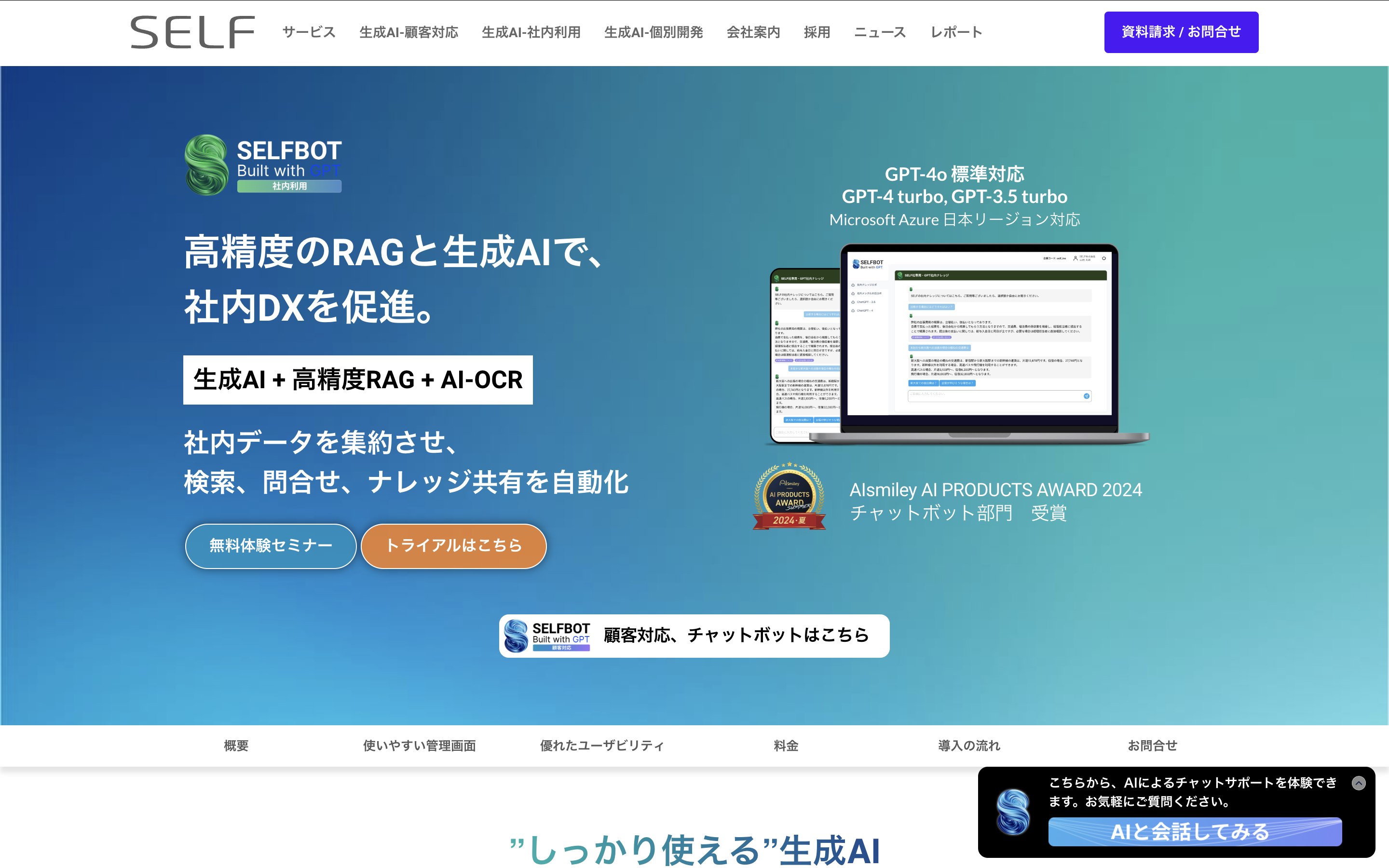 社内対応向けのおすすめ生成AIチャットボットは、「SELFBOT」です。