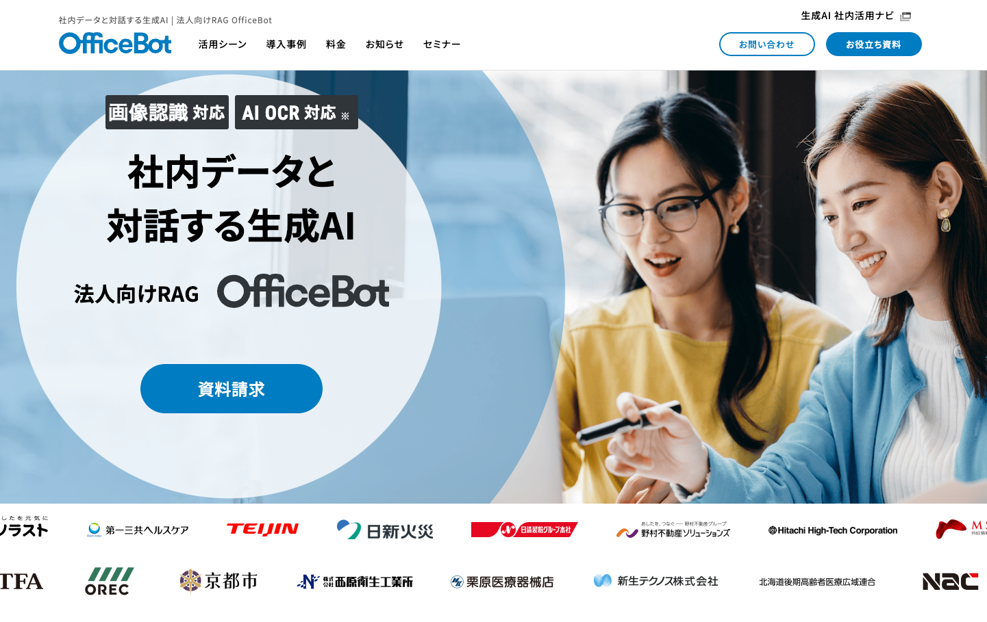 OfficeBotは、社内外の問合せ削減や情報共有の効率化を実現する生成AIチャットボットです。機能は「様々なレイアウトのOfficeドキュメントからPDFまであらゆる社内資料をそのまま活用できる高性能なRAG」が備わっています。