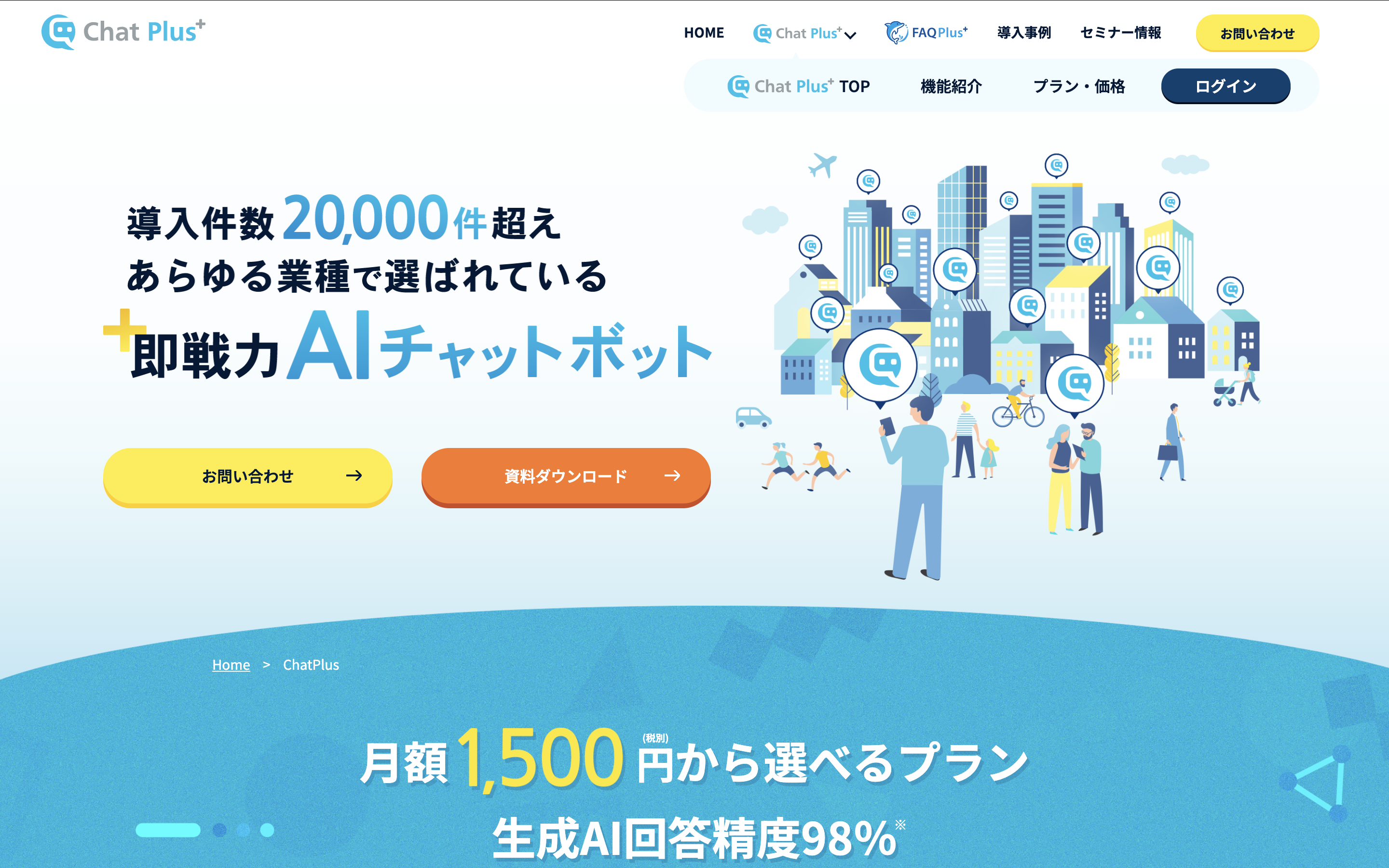 回答精度は「ChatPlus独自AIが『幻覚 (ハルシネーション)』を制御しており、ChatPlus測定値で正答率が98%」と非常に高いといえます。
