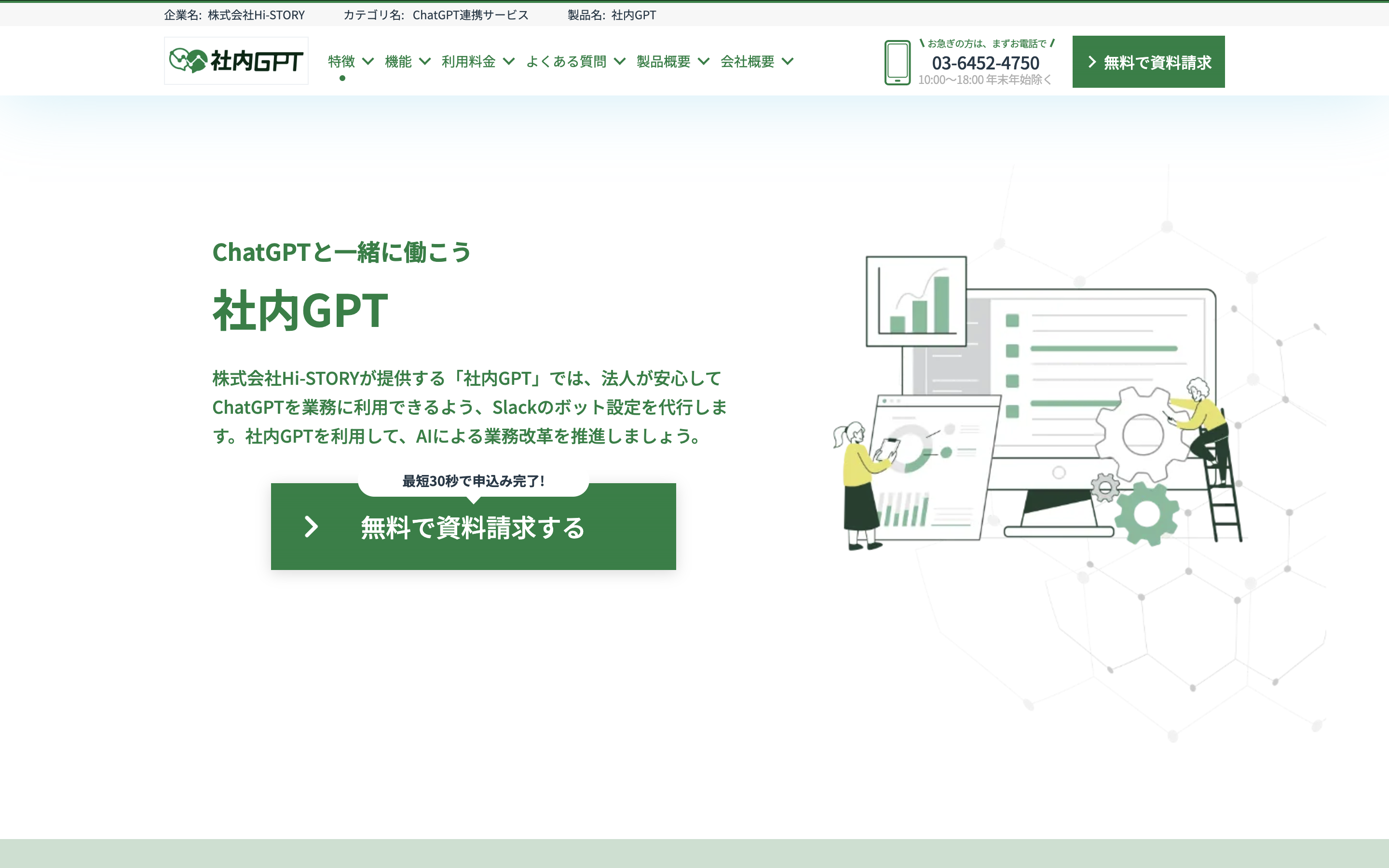 社内GPTは、社内用のChatGPTを導入してくれるサービスです。機能は「Slack上でChatGPTのボットが回答を行ってくれる」というものです。社内対応向けではありますが、RAG機能がないため、あくまでChatGPTとして使う場合におすすめです。