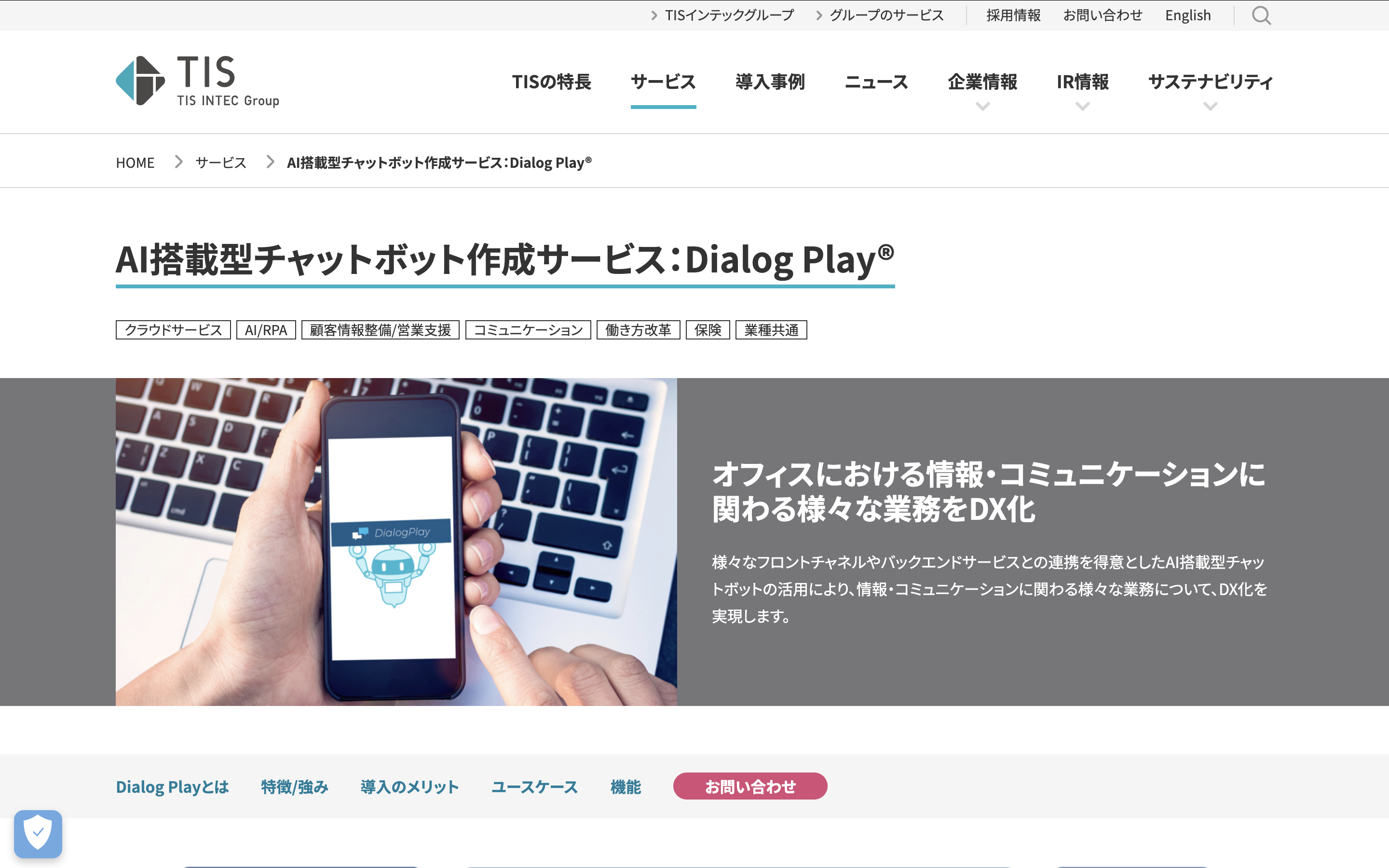 Dialog Playは業務チャットボットを作成できるプラットフォームです。機能は「RAGが実装されたチャットボットをコード不要で作成できる機能」が備わっており、社内の勤怠システムや基幹システムとも連携可能なチャットボットを作れるのが特徴です。