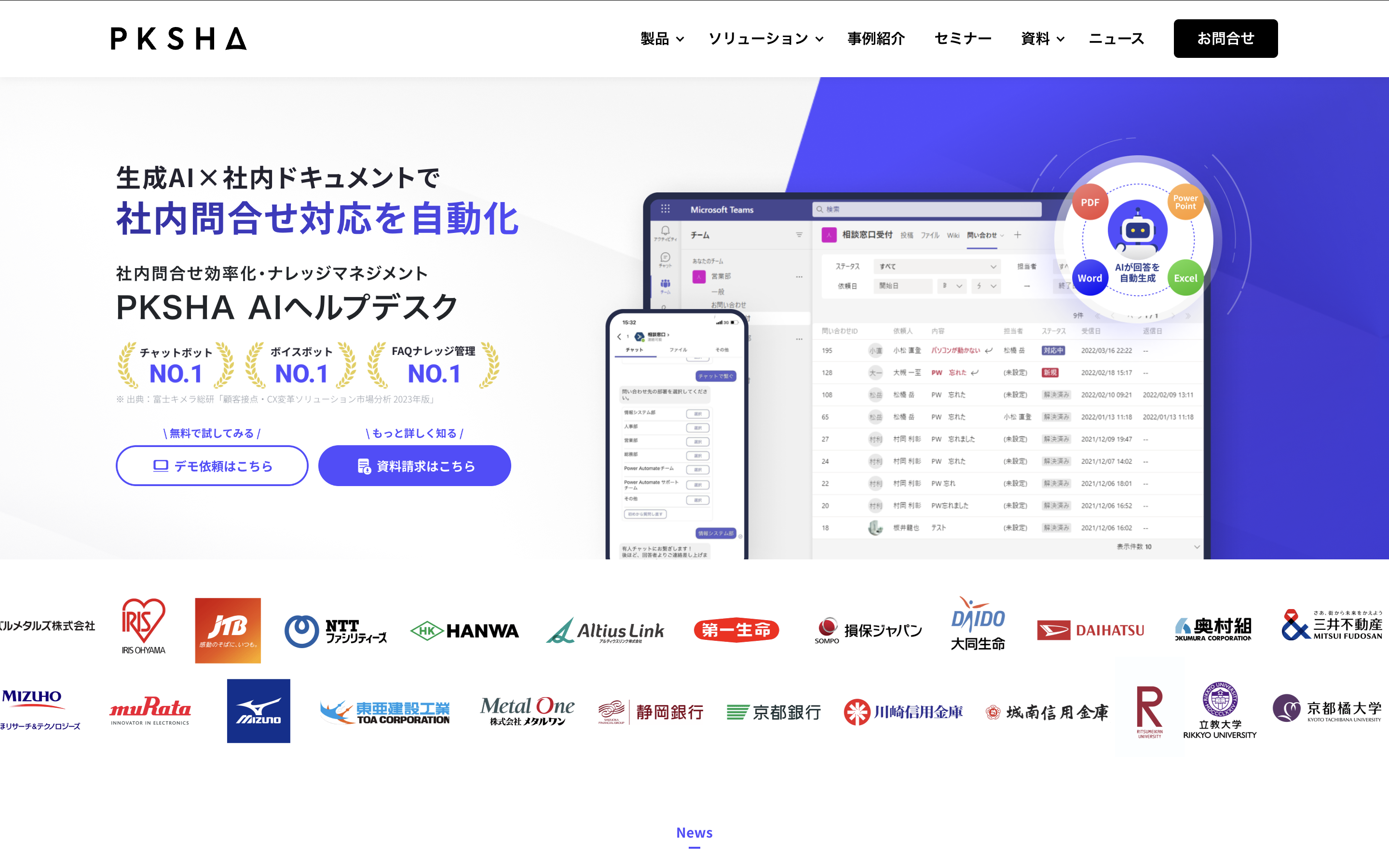 | 3位 | PKSHA AI ヘルプデスク | 10/10 | 9/10 | 10/10 | 29/30 | 社内 | パッケージ | |