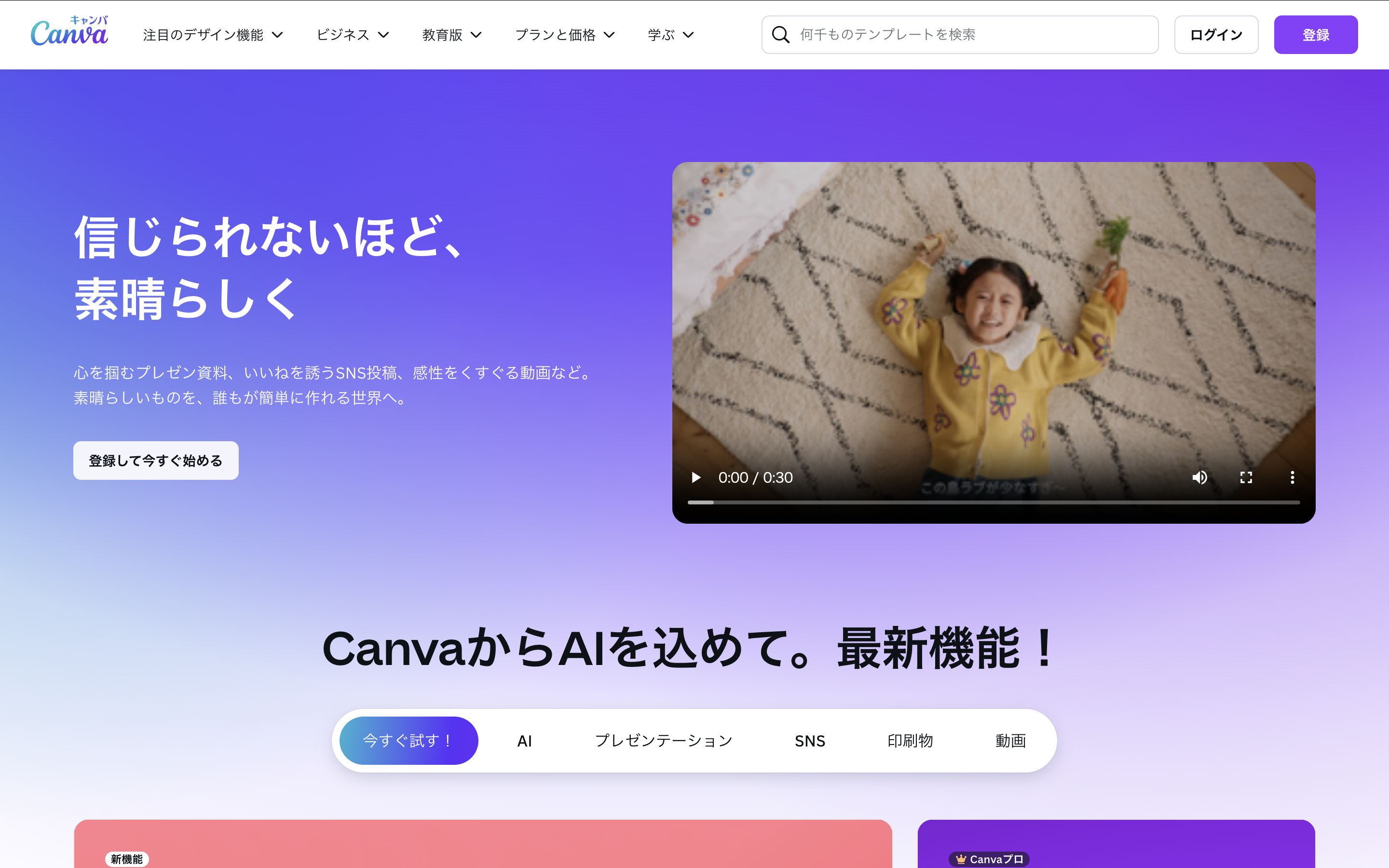 | ①機能の豊富さ | 自然言語だけでなく画像からも作成可能かや、日本語に対応しているか、商用利用が可能か |