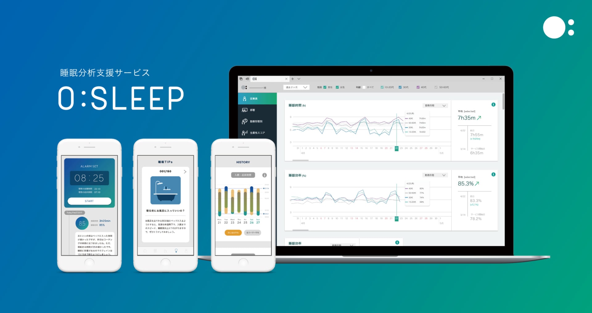 O:は睡眠医学を基にした睡眠コーチングアプリを従業員に展開し、その睡眠状況や生産性を分析、組織やルールの改善点を抽出することで企業を支援します。”